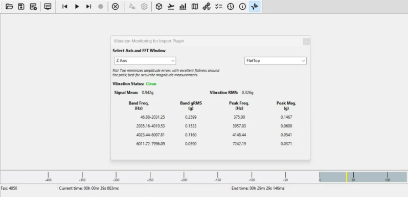 - Update rate & resolution: vibration reports are generated every 0.25 s, with a 4Hz resolution.