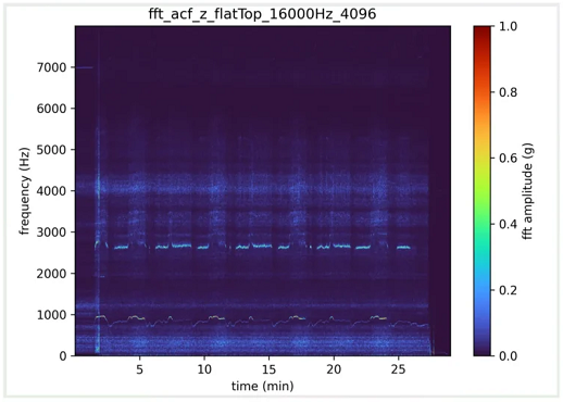 A complete FFT (Fast Fourier Transform) shows vibration amplitude across all frequencies. The following image corresponds to this full spectrum view. It shows the intensity of vibrations measured for each frequency over time.