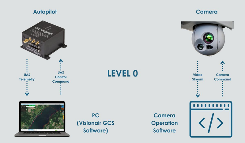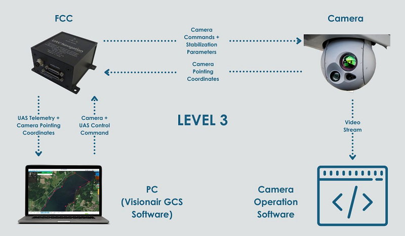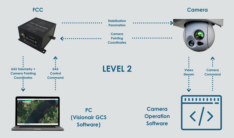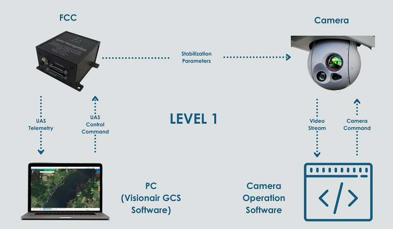The first level involves integrating the gimbal with the flight control system without requiring software integration. This approach offers the client greater flexibility, as it eliminates potential telemetry limitations and communication link issues related to datalink bandwidth.