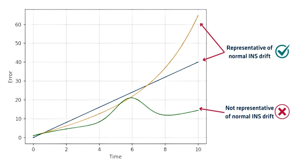 The yellow and blue curves are representative of normal INS drift when the platform is moving in a straight line without GNSS. The error increases steadily over time, either linearly or exponentially, which is expected. On the contrary, the green curve (shape) is not representative of typical INS drift. An error that grows at first (linear or exponential), then forms a “bump” and starts decreasing indicates that the trajectory is not straight.
